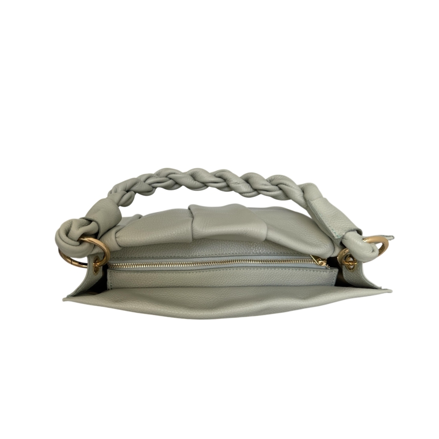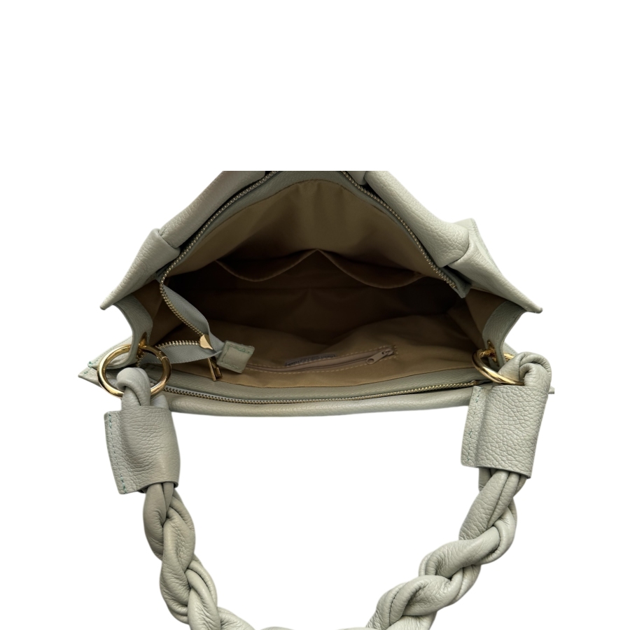 DIANDRA es un bolso de piel con un diseño con aires vintage y un diseño que nunca deja indiferente. Su asa trenzada y los plisados de su piel le convierten en un bolso con personalidad propia. Tiene cierre de cremallera, el interior forrado, cuenta con un bolsillo interior con cremallera y está disponible en 4 colores: verde jade claro, negro, camel y crudo.