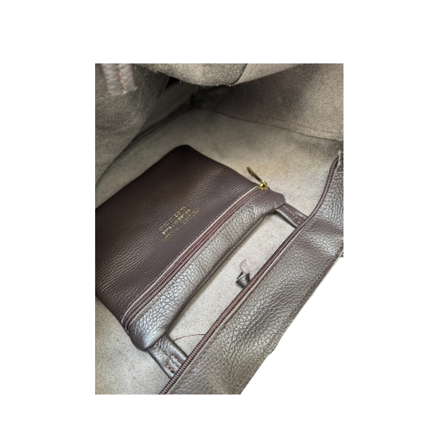 RENATA es un bolso de gran capacidad confeccionado en piel.. Cuenta con cierre superior de cremallera y un bolsillo interior para organizar lo imprescindible. Ideal para el día a día, oficina, universidad o escapadas. Disponible en camel, negro, camel oscuro, burdeos, topo, rojo, beige, azul denim y verde jade. Puede personalizarse con iniciales bordadas.